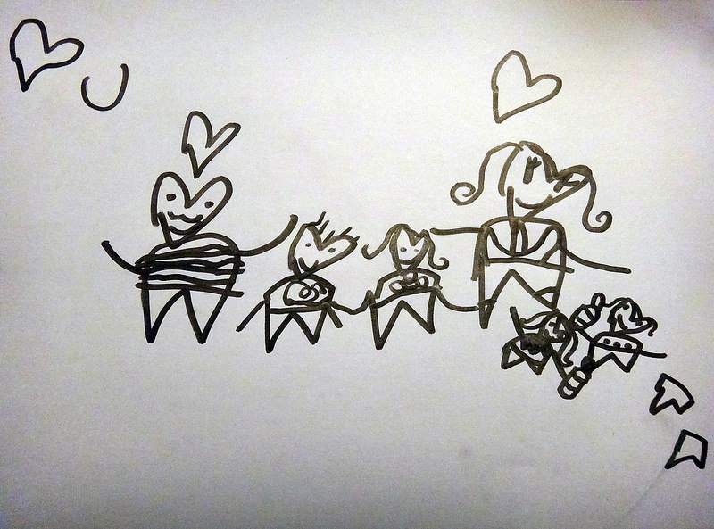 Jade draws everyday … from morning till night. Often, she wants to doodle before going upstairs for story time. I asked her about this particular image. She simply stated, “It is a big loving family.”