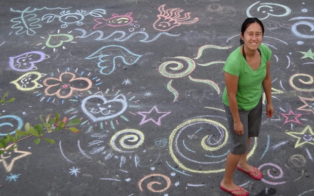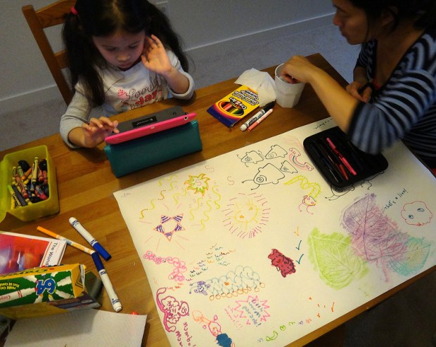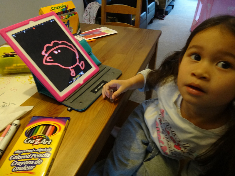 Jade draws a “glowy chicken” on the iPad.