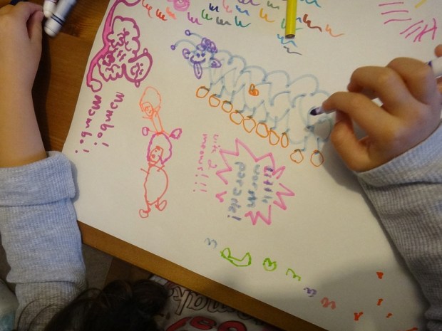 “It’s a little worm parade.” Jade explains the bottom squiggles on the page.